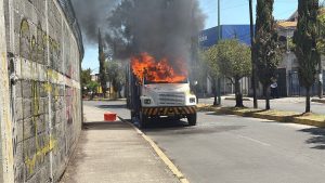 Un camión repartidor de agua fue incendiado por manifestantes de Arantepacua sobre el Libramiento Sur-Poniente de la ciudad de Morelia, justo frente a las instalaciones de la Fiscalía General del Estado (FGE), según trascendió durante la cobertura de la noticia.