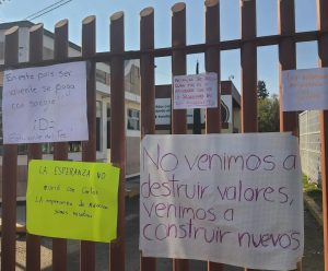 Mantienen su presencia a puertas cerradas y pegadas sus pancartas con consignas. Lo hacen desde las 9 de la mañana en que se apersonan para participar en las actividades correspondientes y se retiran a las 5:30 de la tarde, ya que el paro está siendo activo únicamente en horario escolar, y de lunes a viernes.
