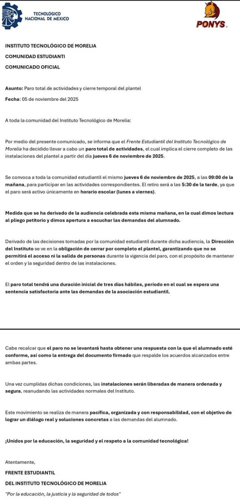 En un comunicado, los jóvenes Ponys del Frente Estudiantil del Instituto Tecnológico de Morelia dejan muy en claro que el paro no se levantará «hasta obtener una respuesta con la que el alumnado esté conforme», respecto a su pliego petitorio y de parte de la directora Calderón Campos, así como la entrega del documento firmado por ella que respalde los acuerdos alcanzados entre ambas partes. Una vez cumplida esta condición las instalaciones serán liberadas de manera ordenada y segura reanudando las actividades normales del Instituto, dice.