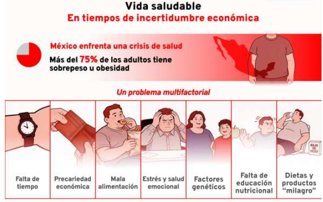 Así como se señala el problema, también es una obligación a hablar con claridad sobre sus causas, sin sesgos y sin falsear la realidad, pues este escenario corresponde a múltiples factores que sufre la población: estrés, mala alimentación, sedentarismo, precariedad económica, factores genéticos, imposibilidad horaria para la adopción de nuevos hábitos, escasa educación nutricional, dietas equivocadas, consumo de productos “milagro” y falta de acompañamiento emocional, se encuentran entre las principales, las cuales dan cuenta de estas patologías que padecen los mexicanos.