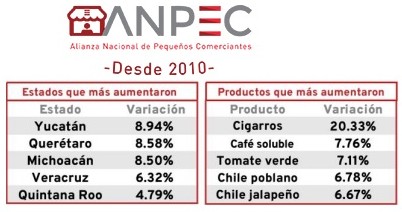 Los productos que más aumentaron en el último mes son cigarros 20.33% (de $88.25 a $106.19), café soluble7.76% (de $145.31 a $156.59), tomate verde 7.11% (de $39.61 a $42.42), chile poblano 6.78% (de $50.75 a $54.19) y chile jalapeño 6.57% (de $39.01 a $41.61).