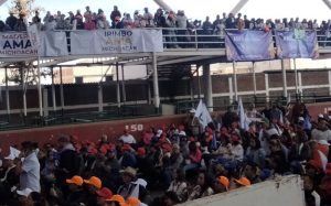 Desde el interior, lonas y pancartas llegadas de distintos puntos del Estado confirmaban una convocatoria de alcance estatal y una operación logística poco discreta.