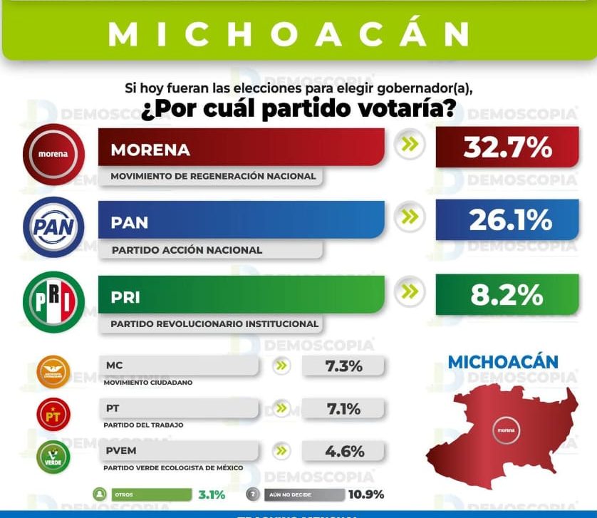En un escenario electoral inmediato en Michoacán, la encuestadora Demoscopía ubica a Movimiento de Regeneración Nacional (Morena) con 32.7 por ciento de intención de voto, mientras que Carlos Torres Piña, titular de la Fiscalía General del Estado (FGE), aparece como el perfil mejor posicionado.