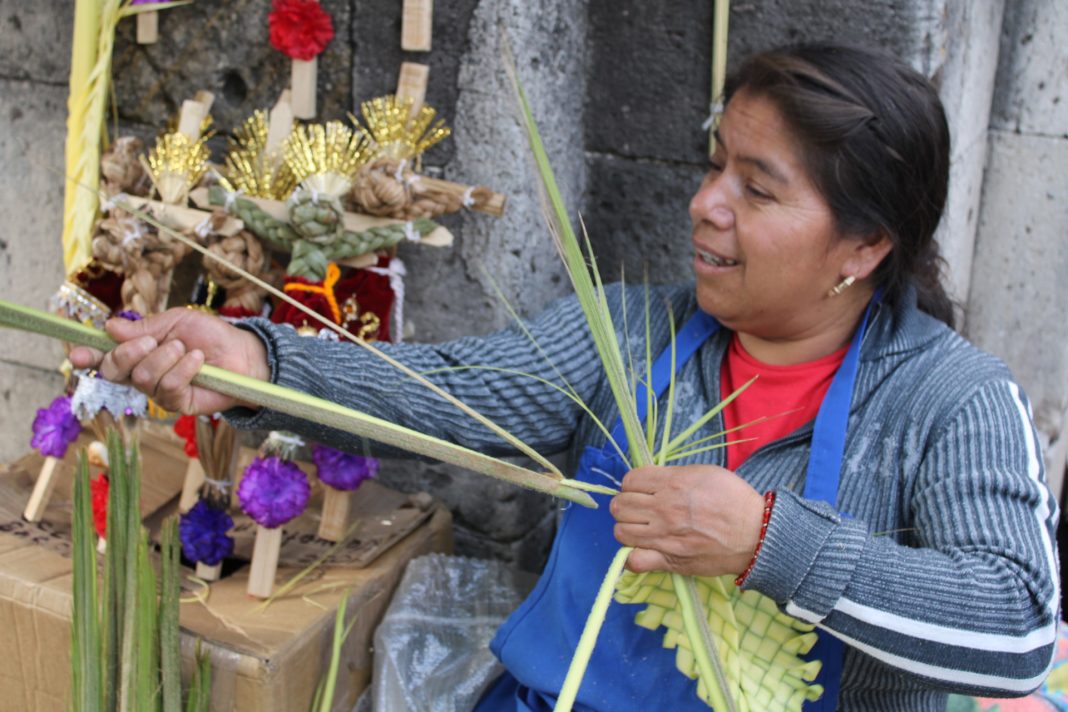 Desde el pasado viernes, Magdalena Jiménez, proveniente de la comunidad de Arantepacua, se encuentra a las afueras del templo de «San Francisco» en Uruapan, ofreciendo sus palmas, siendo una tradición que heredó de muchos años.