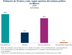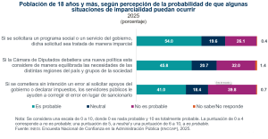 De acuerdo con la ENCOAP 2025, 54.0 % de la población de 18 años y más consideró probable que, al solicitar un programa social o un servicio público, su trámite sería atendido de manera imparcial; 45.8 % manifestó como probable que, si la Cámara de Diputados debatiera una nueva política, esta consideraría de manera equilibrada las necesidades de distintas regiones y grupos sociales; y 41.0 % creyó probable que, si se cometiera sin intención un error al solicitar apoyos del gobierno o declarar impuestos, los servidores públicos le ayudarían a corregir el error en lugar de sancionarlo.