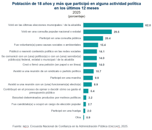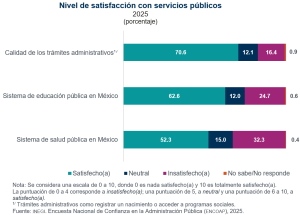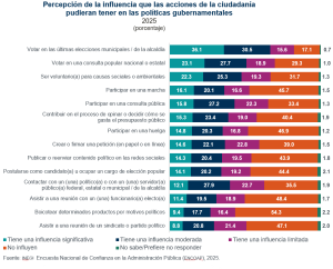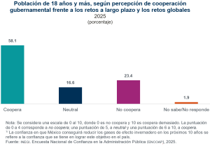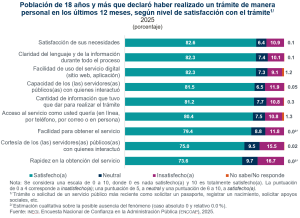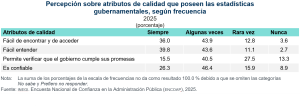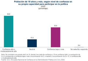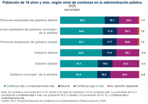 De acuerdo con la ENCOAP 2025, 56.3 % de la población de 18 años y más refirió tener un nivel de confianza alto o moderadamente alto en las personas empleadas del gobierno federal. Siguieron las personas empleadas del gobierno municipal o de la alcaldía, con 54.0 % y las empleadas del gobierno estatal, con 53.7 por ciento.
