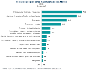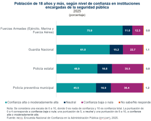 En materia de las instituciones encargadas de la seguridad pública, de acuerdo con la ENCOAP 2025, 75.9 % de la población de 18 años y más indicó tener un nivel de confianza alto o moderadamente alto en las Fuerzas Armadas (Ejército, Marina y Fuerza Aérea).