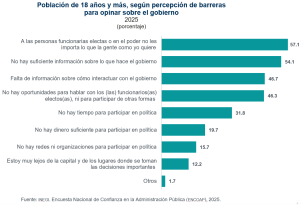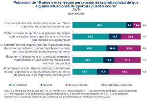 Referente a la percepción del actuar gubernamental para facilitar información y atender la participación ciudadana, 78.4 % de la población de 18 años y más consideró probable que si se necesitara información clara sobre un trámite o servicio, esta sería fácil de encontrar; 53.2 % refirió probable poder expresar su opinión en caso de que el gobierno municipal o de la alcaldía tuviera que tomar una decisión que afectara a su comunidad; 49.6 % señaló como probable que el gobierno federal proporcione una explicación clara sobre cómo una reforma realizada por dicha instancia podría afectarle de manera personal; 44.7 % indicó que es probable que el gobierno federal tome en cuenta las opiniones expresadas en una consulta pública al momento de reformar una política; y 35.7 % manifestó que es probable que, al comunicarse con una o un diputado(a) o senador(a), reciba respuesta a una inquietud relacionada con un tema de política importante para la ciudadanía.