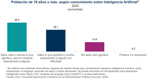 En materia tecnológica, 55.2 % refirió que es probable que el gobierno federal regule adecuadamente las nuevas tecnologías y ofrezca el acompañamiento necesario para que tanto empresas como personas usuarias puedan emplearlas de manera responsable.