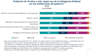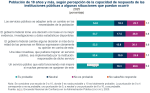 En cuestión de capacidad de respuesta de las instituciones públicas, con la ENCOAP 2025 se estima que 54.8 % de la población de 18 años y más consideró probable que el servicio público se adapte ante un cambio en las necesidades de la ciudadanía; 53.7 % señaló probable que el gobierno federal tome decisiones basadas en la mejor evidencia disponible, incluidas investigaciones y datos estadísticos; 53.5 % refirió probable que el gobierno federal modifique una decisión cuando más de la mitad de las personas en México exprese claramente su desacuerdo; 53.4 % manifestó probable que una institución implemente una idea novedosa que pueda mejorar un servicio público y 52.9 % consideró probable que un servicio público que funciona mal mejore si muchas personas presentan quejas.