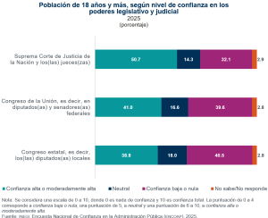 De acuerdo con la ENCOAP 2025, 50.7 % de la población de 18 años y más manifestó tener un nivel de confianza alto o moderadamente alto en la Suprema Corte de Justicia de la Nación y las personas juzgadoras.