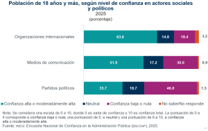 Referente a los actores sociales y políticos objeto de estudios de la ENCOAP 2025, 63.6 % de la población de 18 años y más manifestó tener un nivel de confianza alto o moderadamente alto en organizaciones internacionales.
