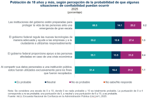Respecto a la confiabilidad de las instituciones, la ENCOAP 2025 estima que 60.5 % de las personas de 18 años y más consideró probable que las instituciones gubernamentales estén preparadas para proteger la vida de las personas ante una emergencia de gran escala.