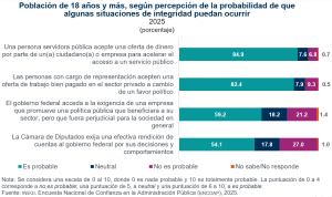 En cuanto a posibles prácticas de corrupción a cambio de favores políticos, 82.4 % reportó que es probable que las personas con cargos de representación acepten una oferta laboral bien remunerada en el sector privado cuando esta implique otorgar un favor político.