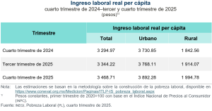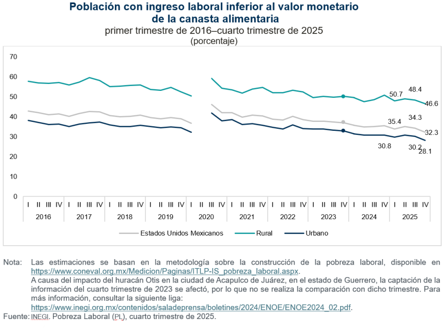 A nivel nacional, la pobreza laboral presentó una reducción respecto al tercer trimestre de 2025 de 2.0 puntos porcentuales: pasó de 34.3 a 32.3 por ciento. Para los ámbitos rural y urbano, la disminución en el mismo periodo fue de 1.8 y 2.1 puntos porcentuales, respectivamente.
