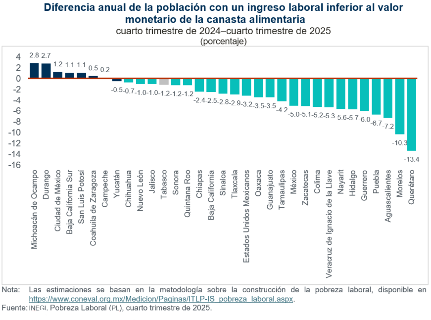 Entre el cuarto trimestre de 2024 y el cuarto trimestre de 2025, la pobreza laboral disminuyó en 25 entidades federativas. Se registraron las mayores disminuciones anuales en Querétaro, con 13.4 puntos porcentuales; Morelos, con 10.3; y Aguascalientes, con 7.2. En contraste, los aumentos más significativos durante el mismo periodo fueron en Michoacán, Durango y Ciudad de México, con incrementos de 2.8, 2.7 y 1.2 puntos porcentuales, respectivamente. Las entidades que registraron las mayores disminuciones trimestrales fueron Querétaro, con 6.4; el estado de México, con 5.7; y Morelos, con 4.0 puntos porcentuales. En contraste, las entidades federativas con mayor aumento durante este periodo fueron Michoacán, Tlaxcala, Baja California Sur y Coahuila, con 1.4, 1.3, 0.8 y 0.8 puntos porcentuales, respectivamente.