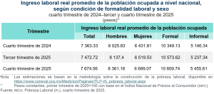 Respecto a la situación de formalidad laboral, en el cuarto trimestre de 2025, la población ocupada formal reportó un ingreso laboral mensual de 10 609.74 pesos y la población ocupada informal, de 5 455.61 pesos. El ingreso laboral real mensual de la población ocupada formal presentó un incremento anual de 2.5 %, mientras que el ingreso de la población ocupada informal creció 6.0 por ciento. En cuanto a la variación trimestral, el ingreso de la población ocupada formal e informal aumentó 0.3 y 4.2 %, respectivamente.