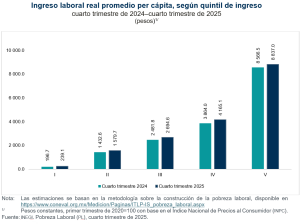 Para mostrar la distribución del ingreso laboral per cápita, el INEGI genera información que permite observar el promedio de este ingreso distribuido en quintiles (cinco grupos con el mismo número de personas). El primero corresponde al 20.0 % de la población con menos ingresos, y el último, al 20.0 % con más ingresos. Entre el cuarto trimestre de 2024 y el mismo trimestre de 2025 se observó un incremento en el ingreso laboral real per cápita de todos los quintiles. Este incremento fue de 21.5, 10.3, 8.6, 7.8 y 3.2 %, respectivamente. Lo anterior contribuyó a una disminución de la desigualdad de los ingresos laborales de acuerdo con el coeficiente de Gini, que pasó de 0.5007 a 0.4885.