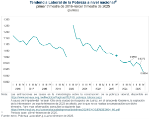 Entre el cuarto trimestre de 2024 y el cuarto trimestre de 2025, el porcentaje de población en situación de pobreza laboral (cuyo ingreso laboral per cápita es inferior a las LPEI, según el ámbito rural o urbano) disminuyó 3.1 puntos porcentuales a nivel nacional: pasó de 35.4 a 32.3 por ciento. En el ámbito rural, disminuyó 4.1 puntos porcentuales: pasó de 50.7 a 46.6 por ciento. Por su parte, en el ámbito urbano disminuyó 2.7 puntos porcentuales al pasar de 30.8 a 28.1 %.