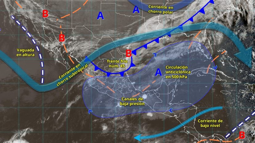 Este día, el frente frío núm. 45 se desplazará sobre el noreste del territorio mexicano y el litoral del golfo de México, interaccionará con un canal de baja presión extendido sobre el sureste del país, propiciando chubascos y lluvias fuertes en el noreste, centro y oriente del territorio nacional, además de lluvias puntuales muy fuertes en Tamaulipas (noreste), Nuevo León (centro y sur), Hidalgo (norte), Oaxaca (norte), Puebla (norte) y Veracruz (norte y centro).