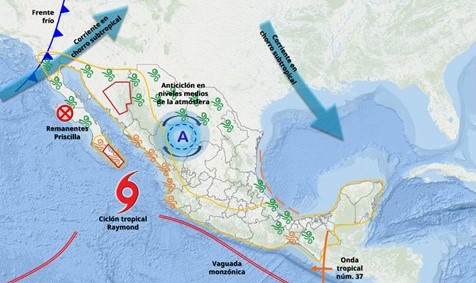 Para este día, la tormenta tropical Raymond se aproximará al sur de Baja California Sur, donde podría tocar tierra en el transcurso del día. Su circulación ocasionará lluvias puntuales intensas en Baja California Sur (centro y sur) y Sonora (centro y este), así como lluvias muy fuertes en Chihuahua (oeste y centro), Durango (oeste), Sinaloa y Nayarit.