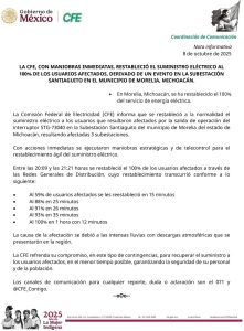 Detalló que existió comunicación y coordinación con la Comisión Federal de Electricidad (CFE), quiénes fueron los encargados de llevar a cabo el reacondicionamiento y reparación de los aparatos dañados que afectaron, de acuerdo al reporte, cerca de 7 colonias.