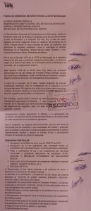 Pero también estipula sus demandas centrales a nivel nacional de abrogación de la ley del ISSSTE 2007, abrogación de la ley de la USICAMM, y en lo estatal también pago de sueldos atrasados y basificación a trabajadores eventuales, como apoyo a programas educativos didácticos, entre varios puntos.