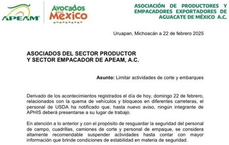 La Asociación de Productores Empacadores y Exportadores de Aguacate de México notificó que personal de USDA no laborará hasta nuevo aviso.