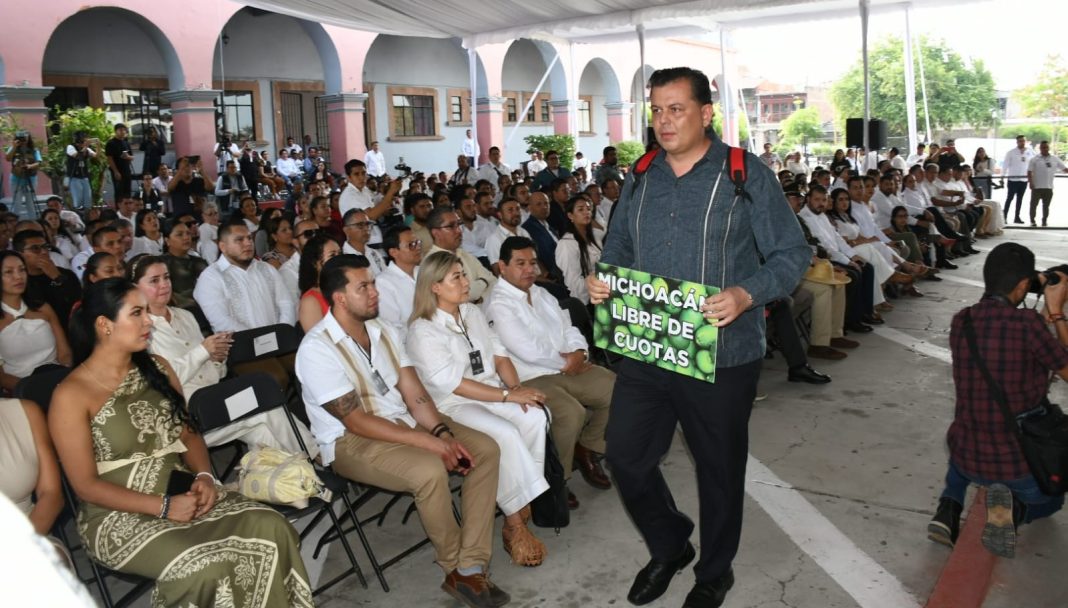 El legislador tricolor que portaba una pancarta con la leyenda “Michoacán libre de cuotas”, en alusión a las extorsiones contra los productores de limón, se levantó de la curul y se retiró de la sesión, en la cual estuvo presente el gobernador michoacano, Alfredo Ramírez Bedolla.