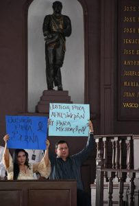 De igual manera, la diputada priista, Adriana Campos Huirache, abandonó la sesión, luego de una protesta con pancartas exigiendo justicia para Bernardo Bravo, quien el lunes pasado fuera encontrado sin vida y con huellas de violencia.