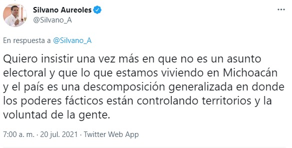 Escribió en sus redes sociales: Quiero insistir una vez más en que no es un asunto electoral y que lo que estamos viviendo en Michoacán y el país «es una descomposición generalizada en donde los poderes fácticos están controlando territorios y la voluntad de la gente.»