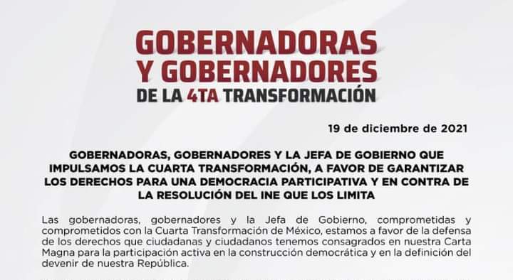 A través de un comunicado, señalaron que los gobernadores, gobernadoras y la Jefa de Gobierno de la CDMX, rechazan los argumentos y la decisión del Consejo General del Instituto Nacional Electoral (INE), de querer impedir el libre ejercicio del derecho a la democracia de los mexicanos sobre la ratificación o revocación de mandato que planteo el titular del Poder Ejecutivo Federal.