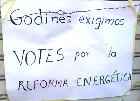Además el manifestante señaló, “hay que denunciar a este señor Enrique Godínez… que no nos suceda lo que ha sucedido en Europa, que privatizaron todo y que ahora los tienen de rodillas a los gobiernos, porque las compañías privadas solamente buscan el interés privado, la ganancia monetaria sin importarles el bienestar del pueblo por eso la energía eléctrica debe estar bajo el control, bajo el dominio del Gobierno Mexicano que debe representar los interés del pueblo y no solamente los interese de un grupo de poder”.