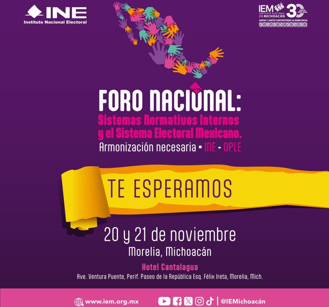 El Instituto Electoral de Michoacán (IEM) será sede del Foro Nacional “Sistemas Normativos Internos y el Sistema Electoral Mexicano. Armonización Necesaria INE–OPLE”, que se llevará a cabo los próximos 20 y 21 de noviembre en la ciudad de Morelia, Michoacán, con la asistencia de autoridades del Instituto Nacional Electoral (INE), del Tribunal Electoral del Poder Judicial de la Federación (TEPJF), de tribunales electorales locales y de los organismos públicos locales electorales (OPLEs) del país.