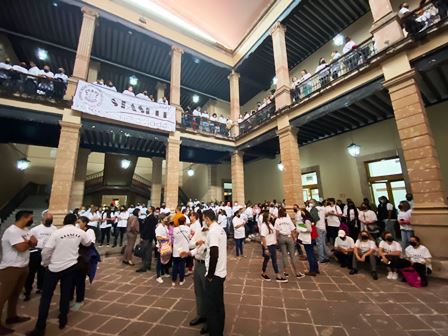 Desde temprana hora, los integrantes del STASPLE arribaron vestidos con playera blanca con la leyenda “Yo sí trabajo, soy STASPLE, no aviador” y se colocaron en el patio principal y diversos pasillos que conforman el recinto parlamentario, mientras los diputados arribaban para intentar sesionar.