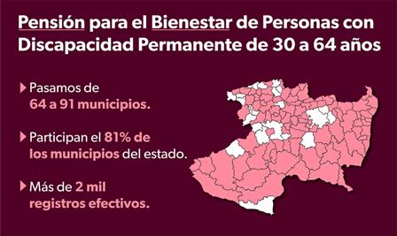 La pensión que el Gobierno del Estado ofrece para apoyar a personas con discapacidad permanente de 30 a 64 años de edad, ya tiene cobertura en 91 municipios de Michoacán.