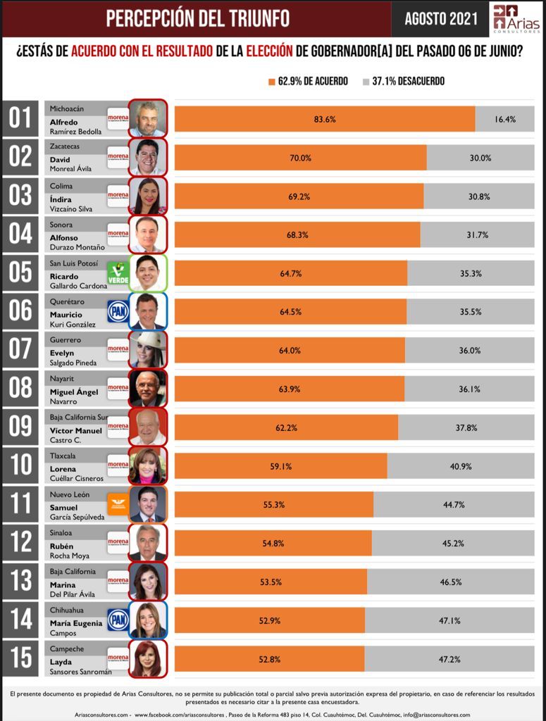 Poligrama es otra casa encuestadora que muestra a Bedolla con una evaluación aprobatoria de 65.73 por ciento, muy cercana a la aprobación del Presidente Andrés Manuel López Obrador que es de 66.15 por ciento.