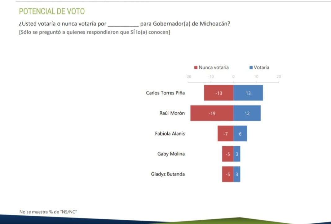 En cuanto al potencial de voto, Carlos Torres Piña tiene un cierre del 13 por ciento de nunca votarían por él con la misma cifra a que sí lo harían. No así Raúl Morón que alcanza un 19 por ciento en la intención de no votar por él.