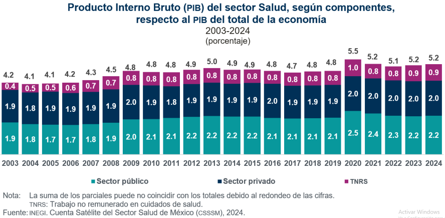 En 2024, el Producto Interno Bruto (PIB) del sector Salud en México reportó un monto de un billón 750 mil 925 millones de pesos en valores corrientes —precios vigentes en el periodo al que se refiere la información—. Esta cifra equivalió a 5.2 % del Producto Interno Bruto (PIB) del total de la economía. Dicho porcentaje lo integraron la producción de bienes y servicios finales relacionados con la prevención, recuperación y mantenimiento de la salud humana, con 4.3 %, y el valor del TNRS, con 0.9 %.