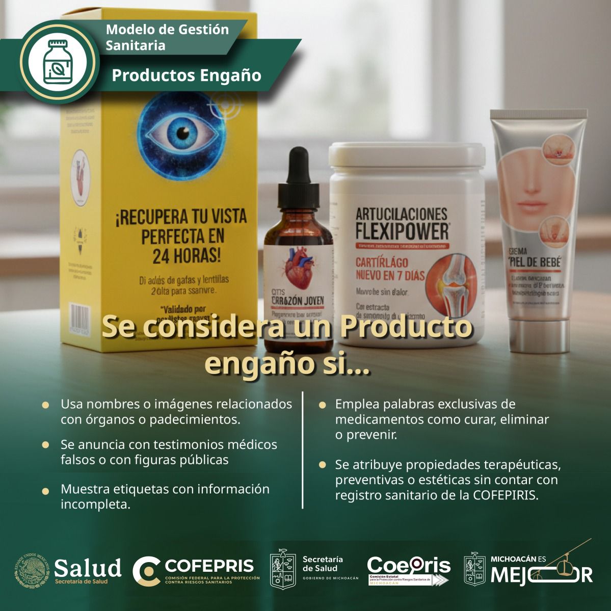 La Secretaría de Salud de Michoacán (SSM), a través de la Comisión Estatal para la Protección contra Riesgos Sanitarios (Coepris), hace un llamado a la población para evitar el consumo y uso de los denominados “productos engaño”, los cuales representan un riesgo para la salud.