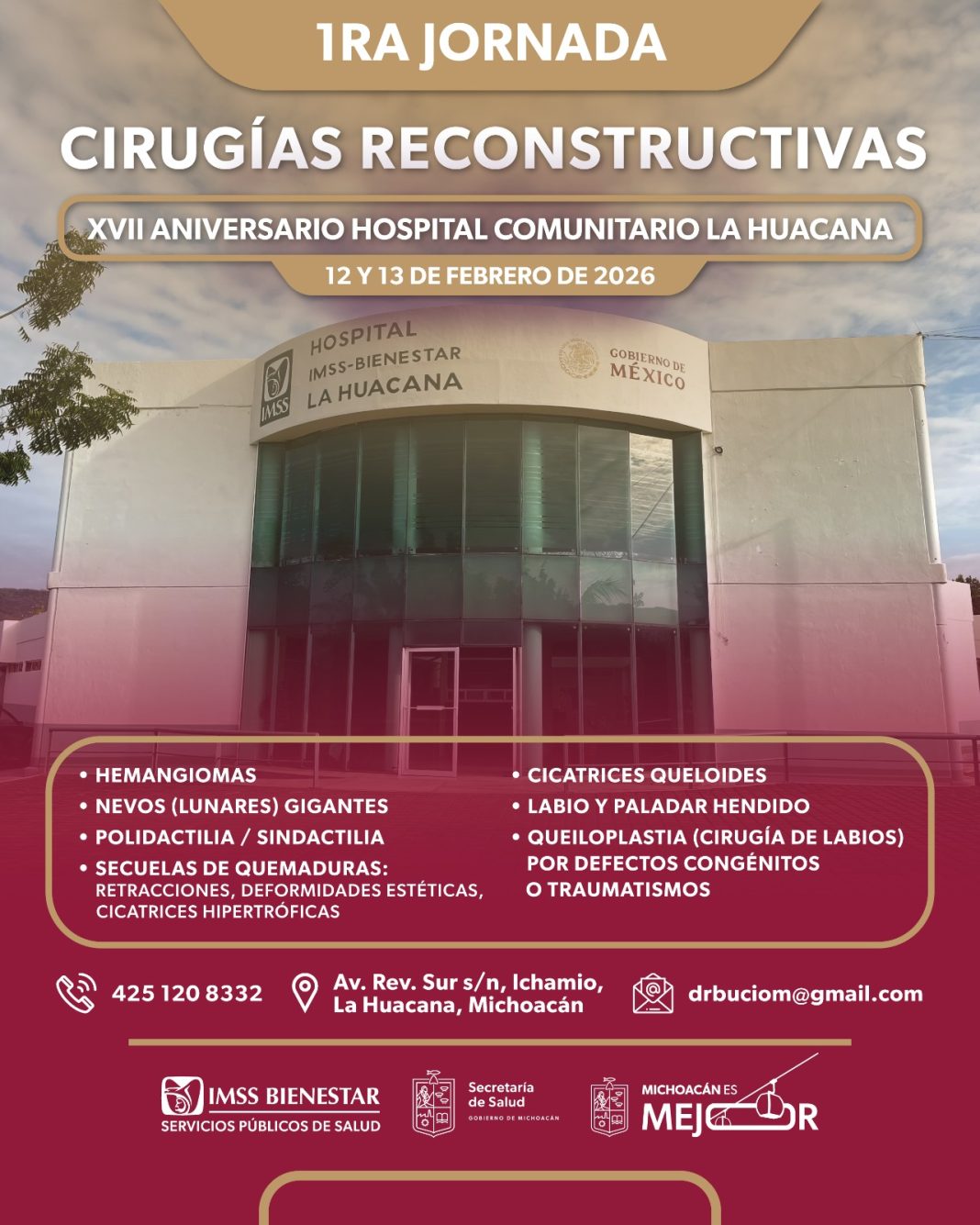 Con el objetivo de mejorar la calidad de vida de las familias de la región de Tierra Caliente, la Secretaría de Salud de Michoacán (SSM) anuncia la Primera Jornada de Cirugías Reconstructivas 2026, la cual se llevará a cabo los días 12 y 13 de febrero en las instalaciones del Hospital Comunitario de La Huacana.
