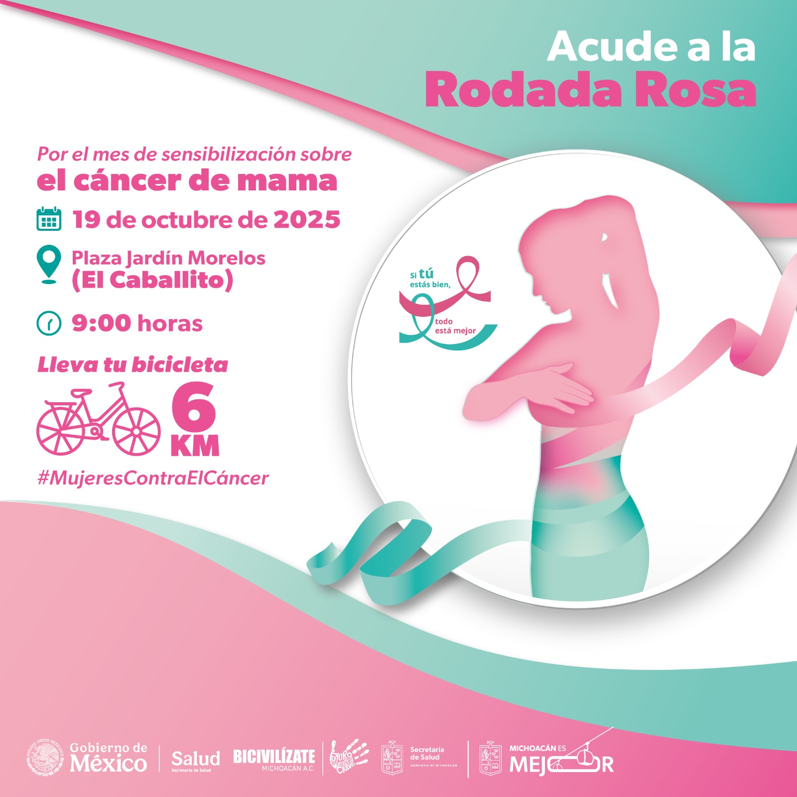 Morelia, Michoacán.- En el marco del Día Mundial contra el Cáncer de Mama, la Secretaría de Salud de Michoacán (SSM) convoca a participar en la rodada rosa y en la Feria de la Salud Integral que se llevarán a cabo el 19 de octubre.