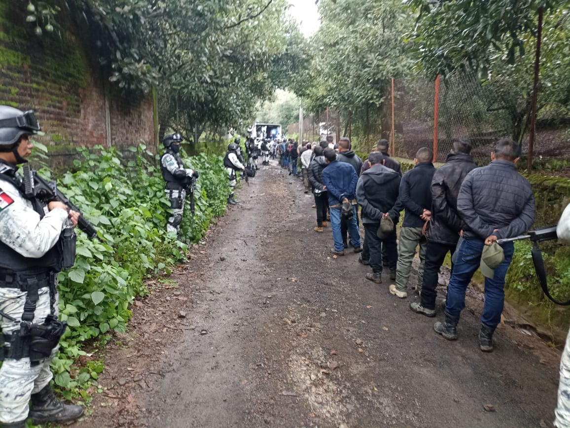 Con motivo de lo anterior, los integrantes de la Guardia Nacional, Ejército Mexicano y Guardia Civil Michoacán, desplegaron en fuerza hacia citado municipio organizados en dos grupos, lo que permitió mediante una reacción adecuada, bloquear al convoy conformado con 25 vehículos en los cuales se transportaban citadas personas sobre un camino de tercer orden, logrando su detención y aseguramiento, sin necesidad de efectuar un solo disparo, con los siguientes resultados: