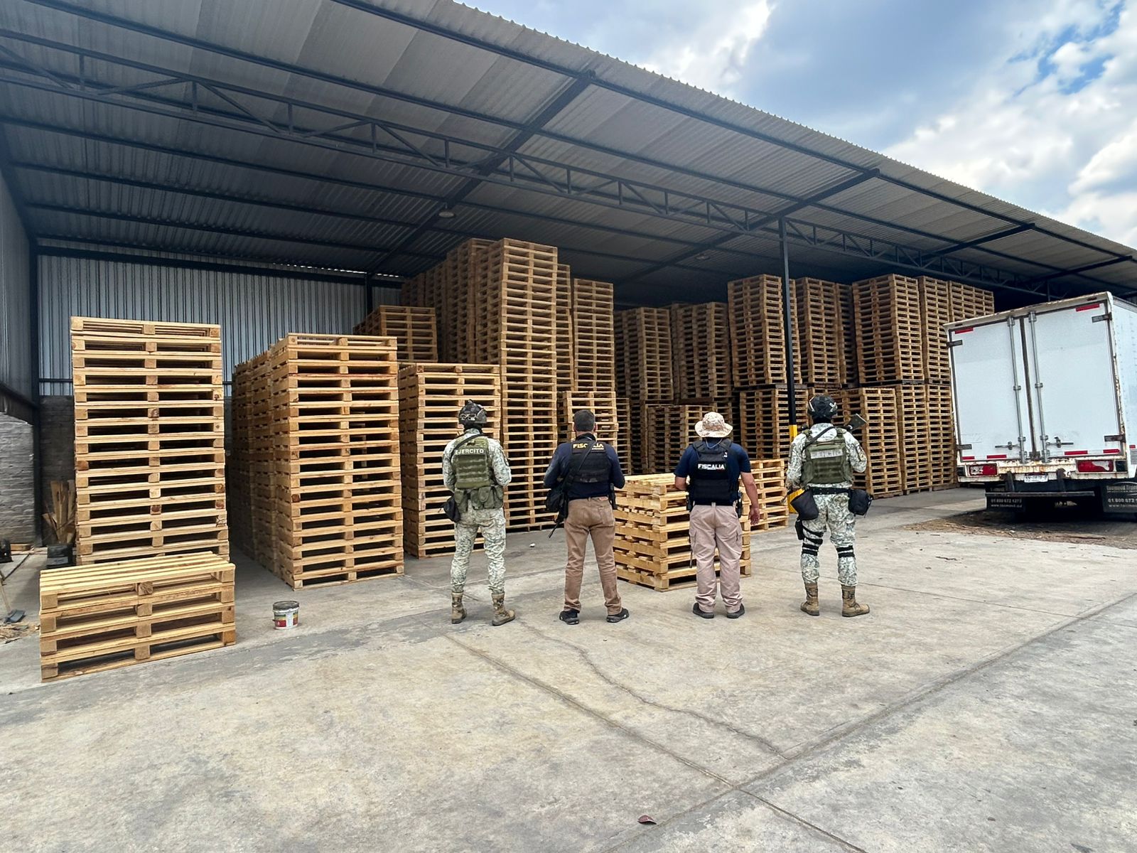Durante el cateo autorizado por una Jueza de Control, personal de la Fiscalía Especializada en Combate a los Delitos Contra el Ambiente y la Fauna, con apoyo de la Secretaría de la Defensa Nacional (DEFENSA), localizó madera procesada, tarimas armadas y maquinaria utilizada para su transformación.