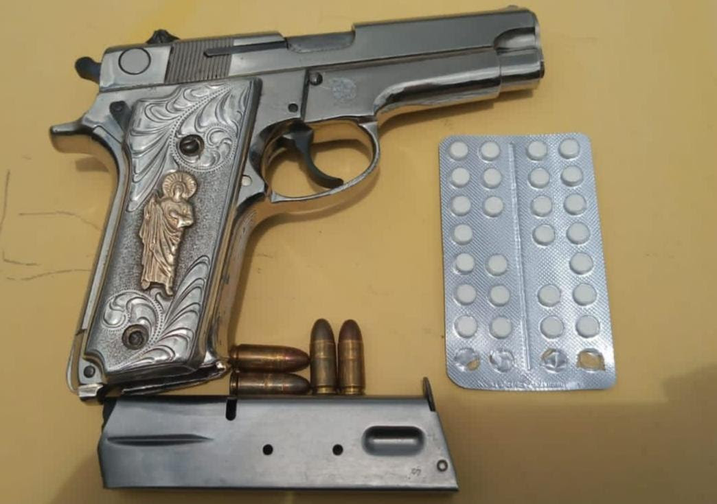 Asimismo, al interior de la unidad fue encontrada una pistola calibre .9 mm., cinco cartuchos útiles, así como las pastillas de medicamento controlado, por lo cual, el vehículo fue puesto a disposición de la autoridad competente a efecto de llevar a cabo las actuaciones pertinentes.
