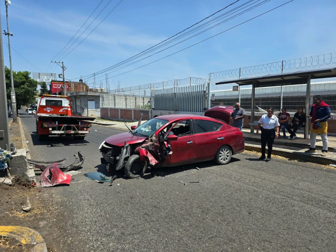Se observó que la unidad siniestrada es de la marca Nissan Versa, color guinda, con placas PNJ562E, la cual terminó con daños en la parte frontal y lateral izquierda. De acuerdo con fuentes policiales, el conductor, la intentar hacer un cambio intempestivo de carril, perdió el control del auto y sucedió el percance.