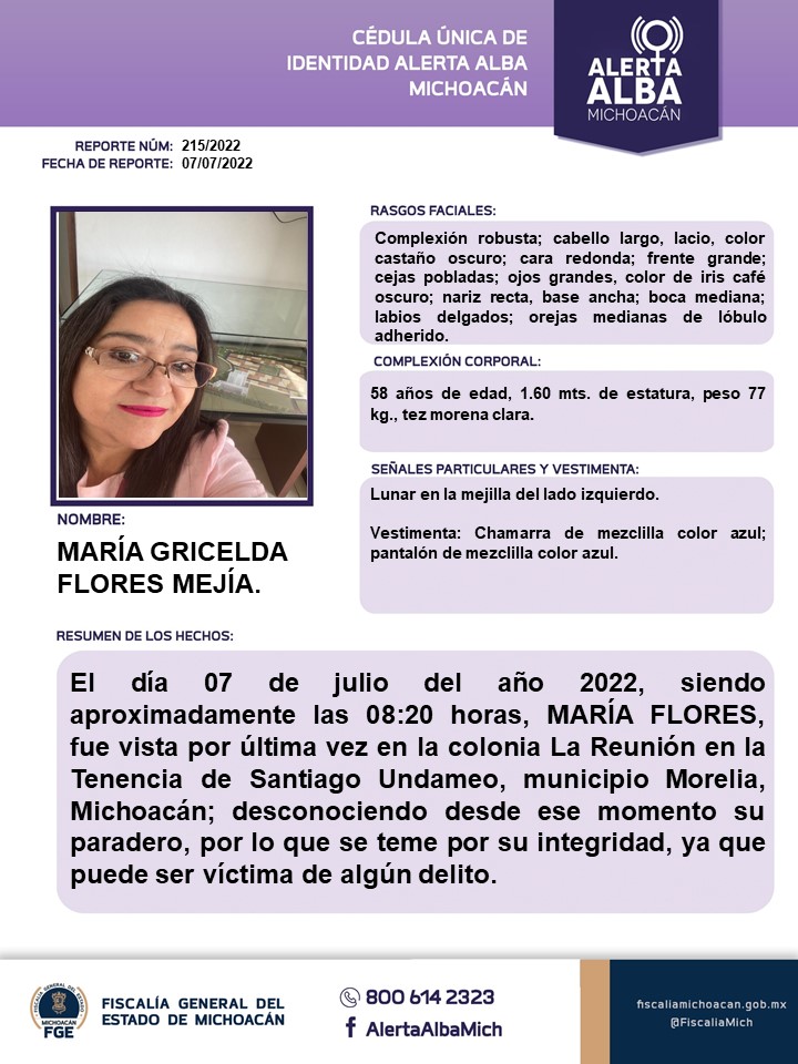 AYÚDANOS A ENCONTRARLA SEGURIDAD 13 de agosto de 2022 Pedimos su ayuda para localizar a María Gricelda Flores Mejía, quien fue vista por última vez en la Tenencia de Santiago Undameo el pasado 7 de julio. Agradecemos cualquier información que ayude a dar con su paradero lili Cuota FacebookTwitterWhatsAppEmailTelegram Noticias Recientes Estado Siguen marchas en el estado por Carlos Manzo Artemio Nava - 4 de noviembre de 2025 Educación Alumnos del Tec extienden toma a los dos campus por hartazgo de proceder y manejos de directora Artemio Nava - 4 de noviembre de 2025 Morelia FGE libera a la mayoría de los detenidos tras disturbios en Palacio de Gobierno Artemio Nava - 4 de noviembre de 2025 Estado Inicia campaña el Tribunal de Disciplina Judicial te escucha, no te quedes callado ¡Denuncia! Artemio Nava - 4 de noviembre de 2025 Morelia Llama alcalde a mantener manifestaciones pacíficas y rechaza politización de las protestas Artemio Nava - 4 de noviembre de 2025 SEGURIDAD Hombre muere prensado tras choque vehicular en la autopista Uruapan-Pátzcuaro Artemio Nava - 4 de noviembre de 2025 Morelia Alfonso Martínez pide una distribución más justa del presupuesto federal Artemio Nava - 4 de noviembre de 2025 Estado Se reporta bloqueo en Uruapan – Carapan,el resto de carreteras libres Artemio Nava - 4 de noviembre de 2025 Estado Con reactivación de trámites de apelaciones en Región LC, el PJM acerca la justicia a la ciudadanía Artemio Nava - 4 de noviembre de 2025 Morelia Pendiente la situación legal de 8 de los 11 detenidos tras disturbios en el Centro Histórico de Morelia Artemio Nava - 4 de noviembre de 2025 Noticias Relacionadas Estado Mediciones en redes sociales, crimen de Manzo tuvo un alcance de 12.9 mil millones de menciones 4 de noviembre de 2025 Estado Siguen marchas en el estado por Carlos Manzo 4 de noviembre de 2025 Educación Alumnos del Tec extienden toma a los dos campus por hartazgo de proceder y manejos de directora 4 de noviembre de 2025 Morelia FGE libera a la mayoría de los detenidos tras disturbios en Palacio de Gobierno 4 de noviembre de 2025