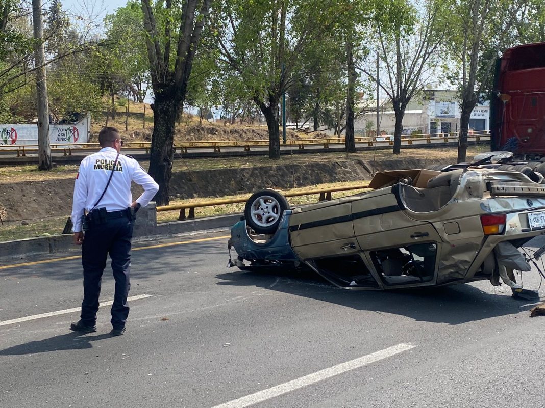 Morelia, Mich.- El conductor de un auto particular se salvó de milagro, luego de su unidad chocara contra la base de un poste de señalamiento vial, impactara con una camioneta y volcara varias ocasiones, en el Libramiento Norte de Morelia.