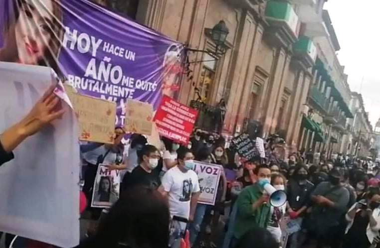 Un grupo de manifestantes adheridos a la exigencia se movilizaron frente a Palacio de Gobierno esta tarde, fecha en que se cumple un año de la muerte de la joven mujer. Ahí, muchachas embozadas gritaron consignas y pintaron manos rojas sobre la fachada del inmueble.