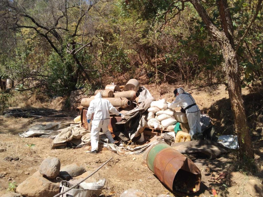 Apatzingán, Mich.- Un narcolaboratorio que de acuerdo con fuentes militares y policiales pertenecía a la célula delictiva del «Barbas de Acahuato» fue localizado y destruido por el personal de la Guardia Civil, del Ejército, de la Fiscalía General del Estado y de la Guardia Nacional, en un reciente operativo hecho en el municipio de Apatzingán.